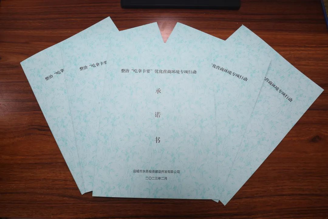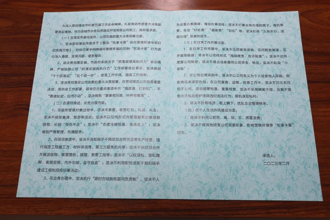 會上,公司黨委委員、紀委書記王望寬宣讀了市水投公司《整治“吃拿卡要”優化營商環境專項行動實施方案》。根據此次專項行動提出的30種“吃拿卡要”行為,結合公司實際,從落實市委市政府、公司黨委的重大決策部署方面;項目推進、業務辦理方面;日常工作開展方面;個人生活作風建設方面,制作了水投公司整治“吃拿卡要”優化營商環境專項行動承諾書。