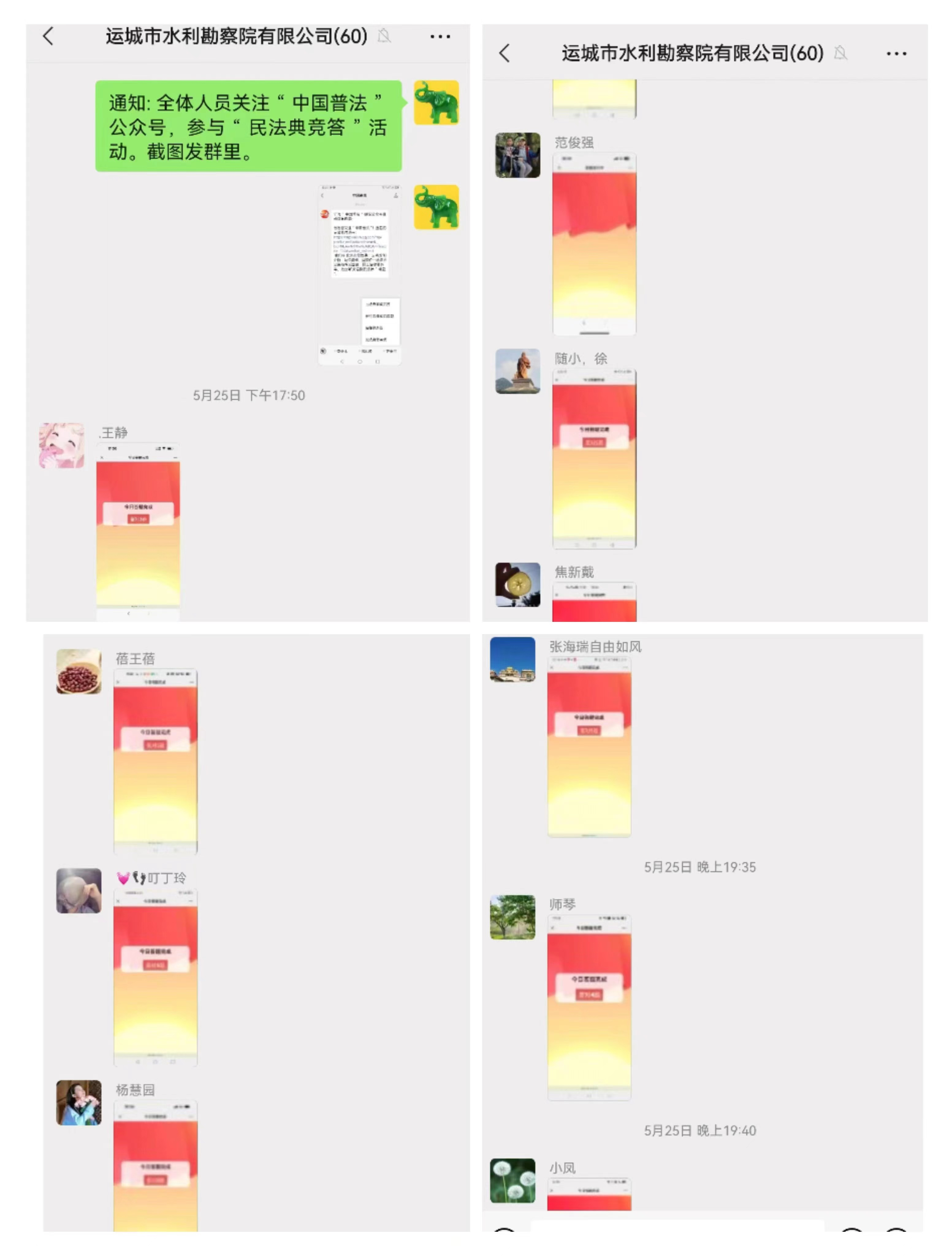 5月26日,公司組織全體干部職工參與《民法典》知識競答活動,活動以線上答題形式展開,通過關注并登錄“中國普法”微信公眾號,在“齊參與”欄目中進行。職工們積極踴躍,迅速掀起了答題熱潮,堅持每日答題,在公司形成了學習法典、運用法典、崇尚法典的良好氛圍。此次活動的開展,讓全體干部職工切實意識到民法典在工作生活中保護自身合法權益方面的重要作用,進一步提高了干部職工的學法氛圍和法治意識,為建設團結和諧、文明進步的大美運城提供了堅強的法治保障。