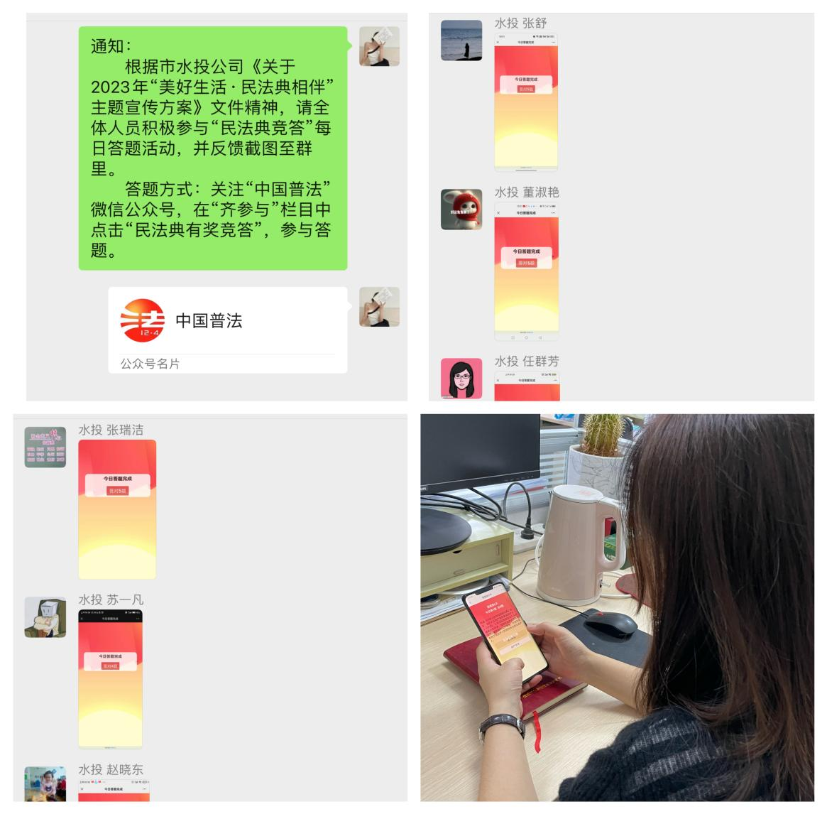根據市水投公司《關于2023年“美好生活·民法典相伴”主題宣傳方案》文件精神,我公司高度重視,堅持以習近平新時代中國特色社會主義思想為指導,深入學習貫徹習近平法治思想,落實省市關于“美好生活·民法典相伴”主題宣傳活動,做好《民法典》學習宣傳工作,引導 廣大干部群眾養成自覺學法守法意識,培養解決問題靠法的意識和能力。