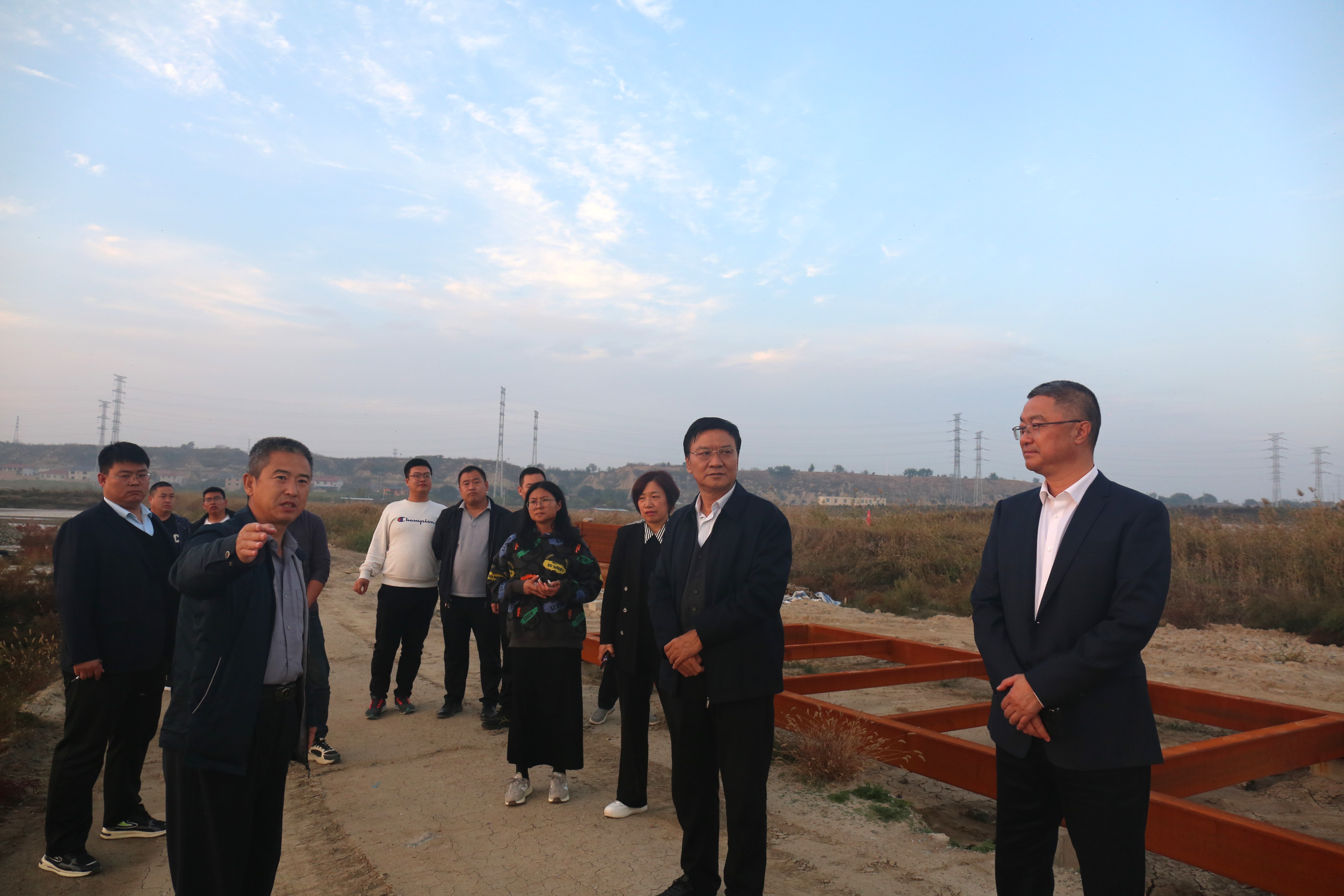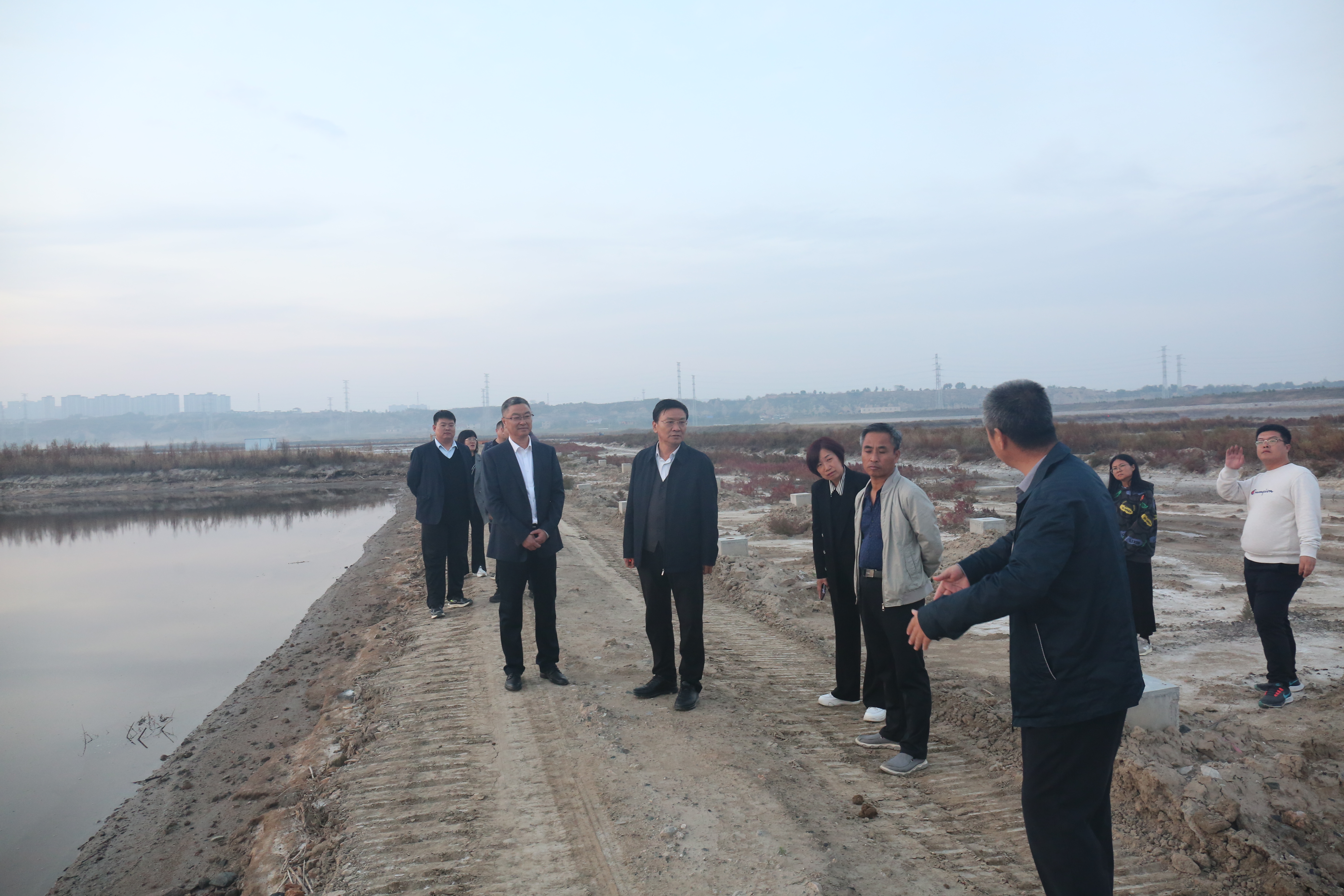 公司領(lǐng)導(dǎo)調(diào)研鹽湖堤埝治理項目(一期)木棧道施工現(xiàn)場