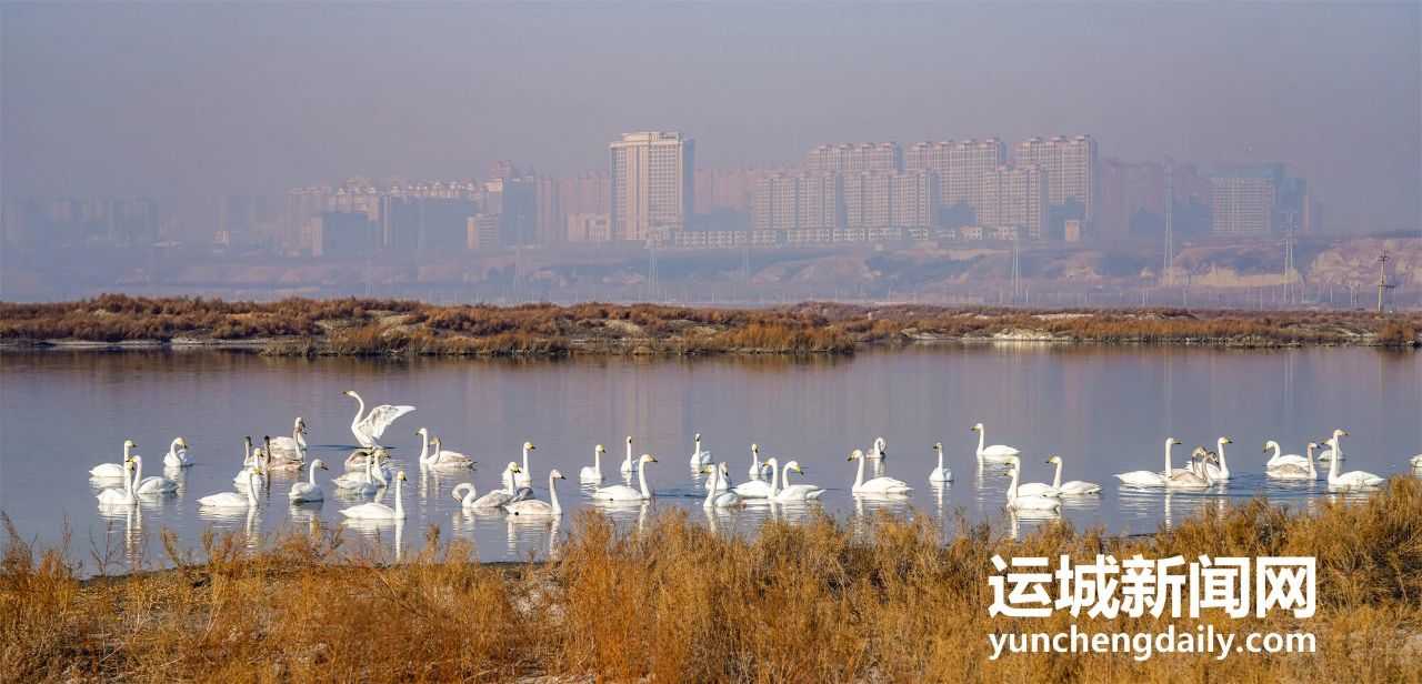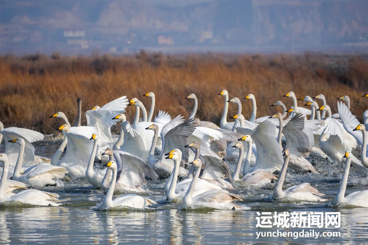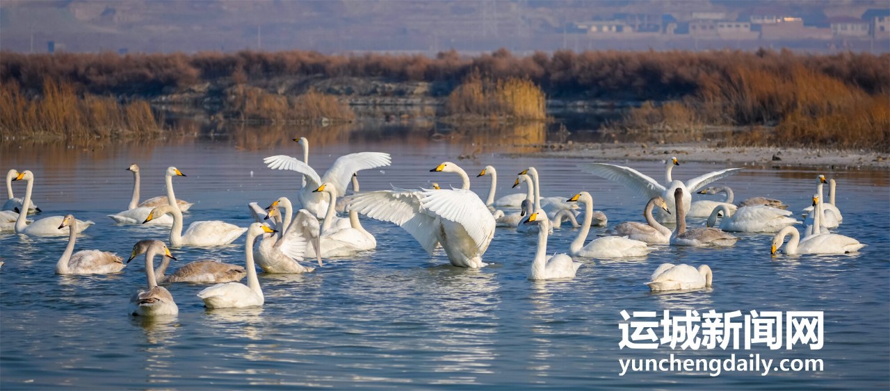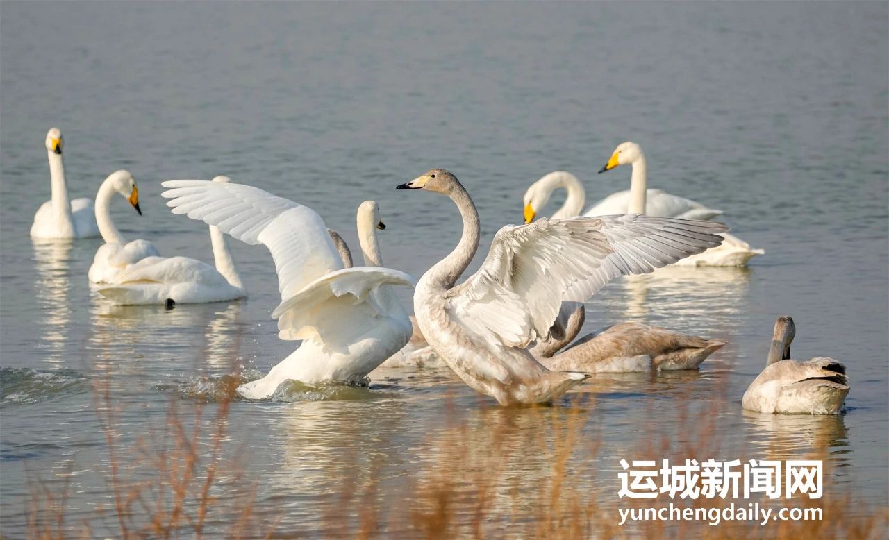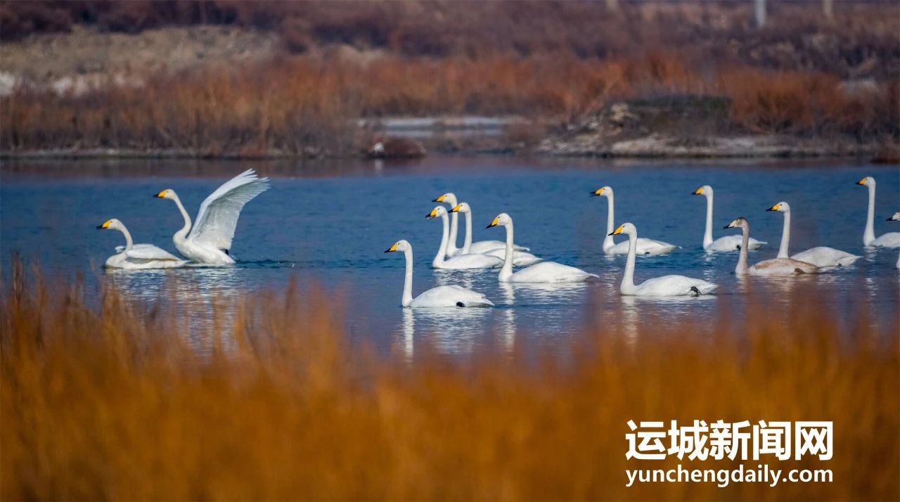 冬日時節,近百只天鵝飛抵鹽湖濕地棲息越冬,它們時而嬉戲、時而飛翔,成為冬日鹽湖一道靚麗的風景,吸引眾多游客前來觀賞。