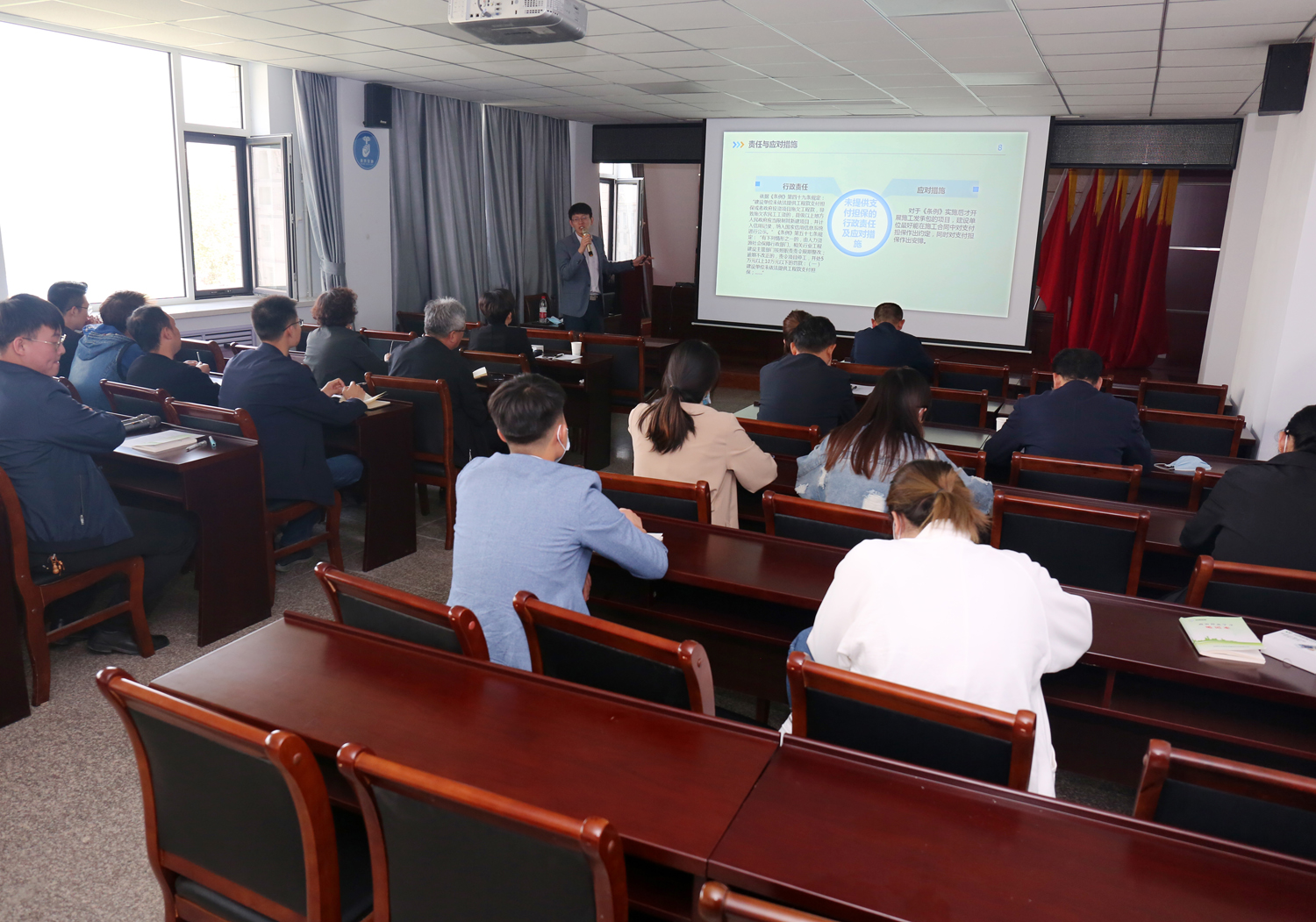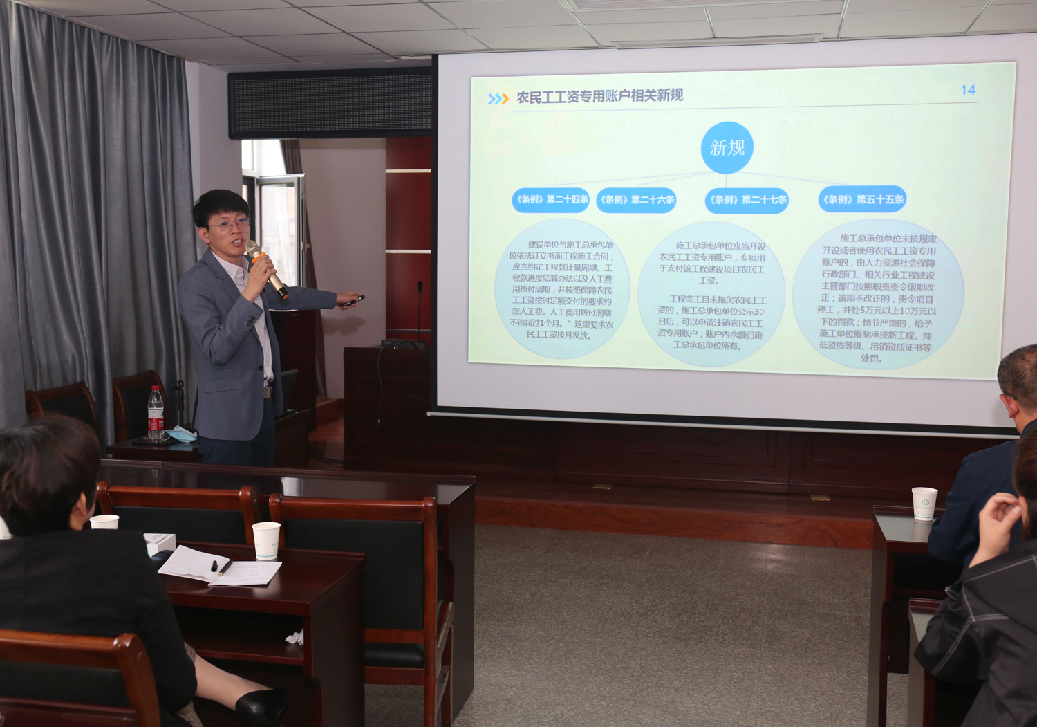 為規范農民工工資支付行為,維護農民工勞動報酬權益,切實保護農民工合法權益,4月24日,我公司特邀請公司法律顧問單位山西衡霄律師事務所楊舟律師對國務院印發《保障農民工工資支付條例》進行授課培訓。公司董事長兼總經理崔作銘、副總經理范永勝、下屬三家單位負責人、姚暹渠禹都段項目公司、鴨子池項目公司相關人員及公司機關人員參加培訓。