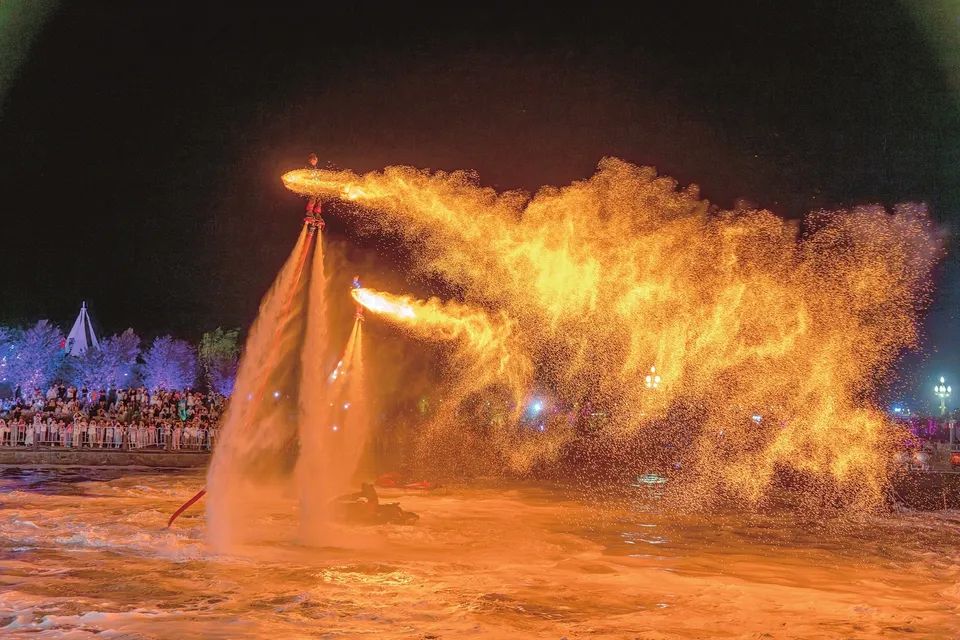 “五一”假期,鹽湖景區“水上飛人”為游客表演飛天火壺。閆鑫攝
